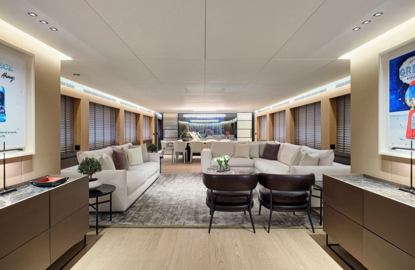 The C-shaped stern sofa fits around a stylish coffee table and before the glass doors leading into the main salon there are a couple of armchairs resting on top of a plush outdoor rug.