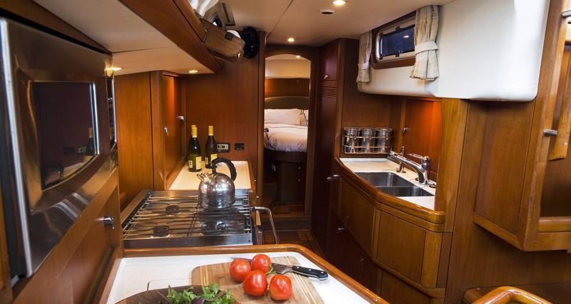 State of the art entertainment systems include a flat screen TV, DVDs, games and more. Ample hatches and ports throughout the yacht ensure optimum sea breezes and plenty of natural light. Guest accommodation is fore and aft of the salon.