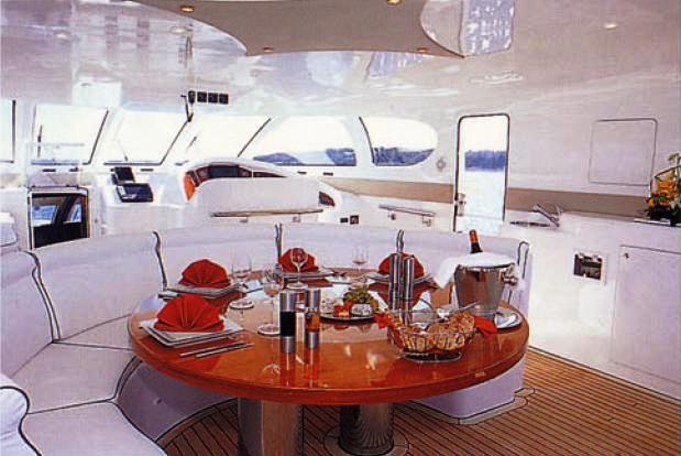 Her main saloon integrates a social bar area and a formal dining area for eight people. For shading the guests from the harsh sun the top deck is partially covered for those who wish to relax without over heating.
