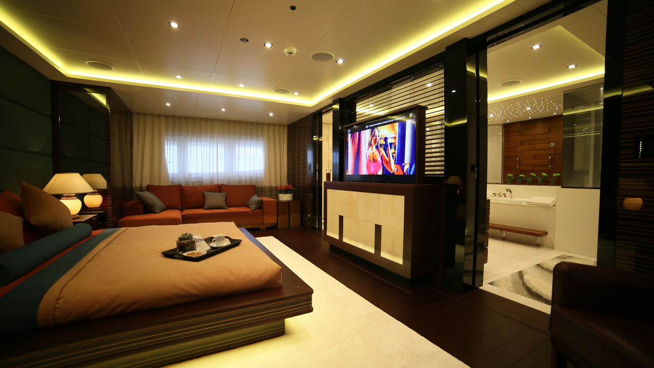 The owners cabin and office is located forward. The living space is light and airy, and is perfect for socialising and relaxing. It has two large, plush sofas, in a rich black cherry shade, as well as two armchairs that surround a low coffee table and large curved screen TV.