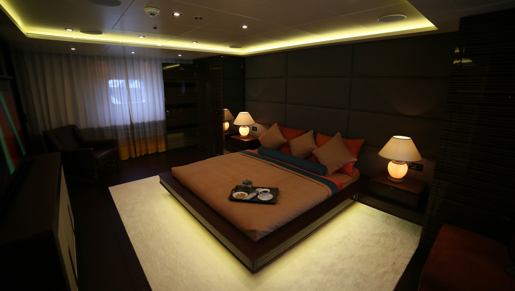 The owners cabin and office is located forward. The living space is light and airy, and is perfect for socialising and relaxing. It has two large, plush sofas, in a rich black cherry shade, as well as two armchairs that surround a low coffee table and large curved screen TV.