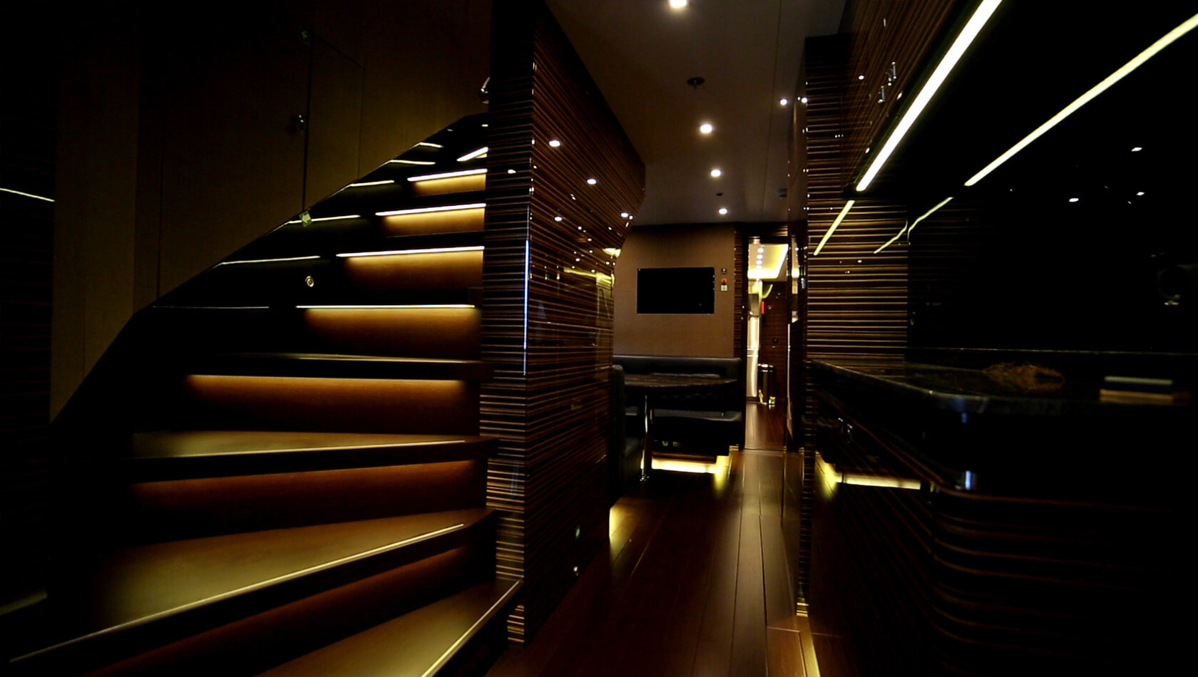 The sundeck boasts a pool, a bar, a BBQ, and a skylight to the upper deck foyer.