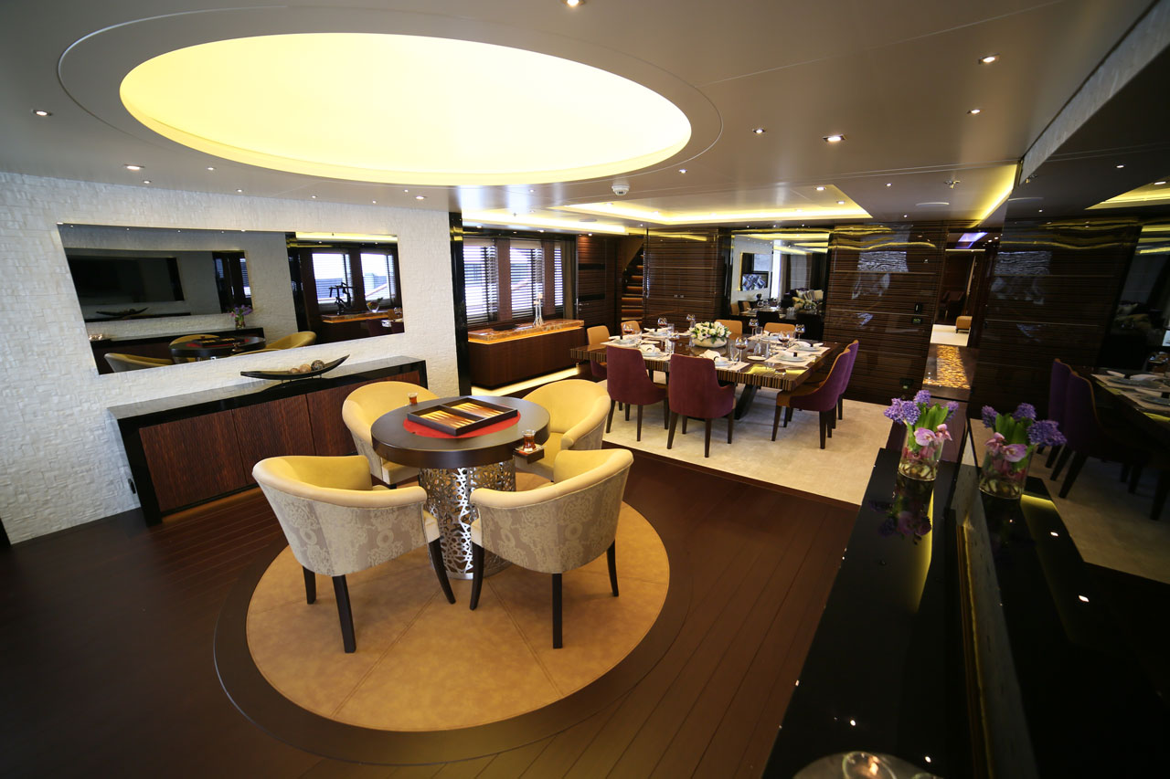 Her main deck is elegant and comfortable, with a large salon, bar, game room and dining room for 10 guests. The owners cabin and office is located forward. The living space is light and airy, and is perfect for socialising and relaxing.