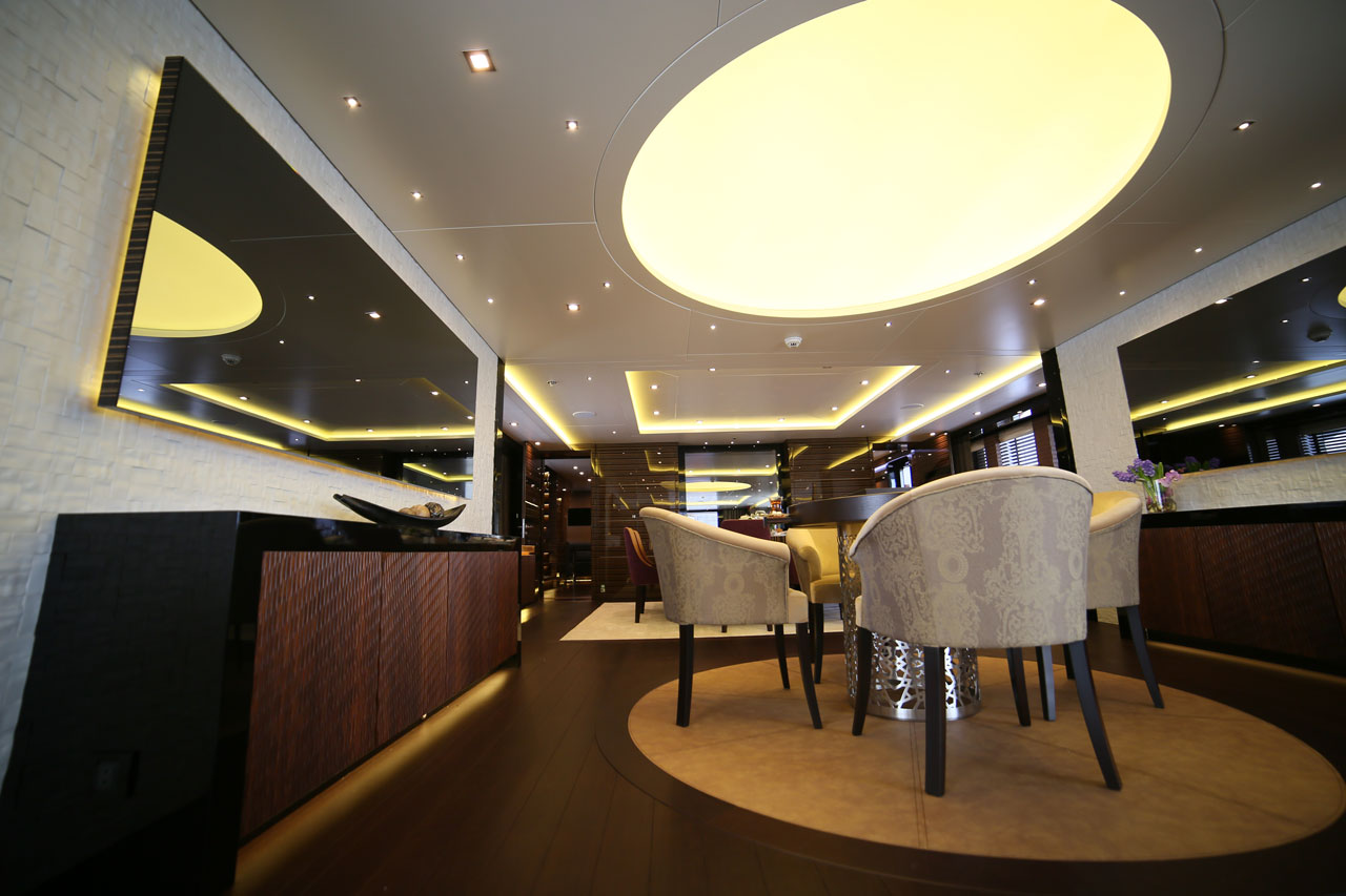 Her main deck is elegant and comfortable, with a large salon, bar, game room and dining room for 10 guests. The owners cabin and office is located forward. The living space is light and airy, and is perfect for socialising and relaxing.