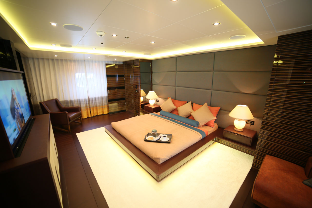 The owners cabin and office is located forward. The living space is light and airy, and is perfect for socialising and relaxing. It has two large, plush sofas, in a rich black cherry shade, as well as two armchairs that surround a low coffee table and large curved screen TV.