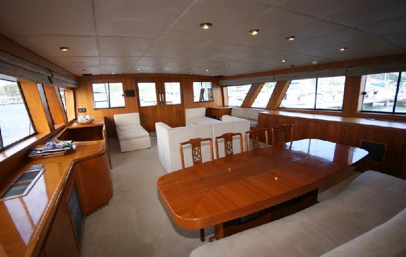 The main salon and dining are open plan, allowing for versatile uses from intimate social gatherings, to cocktail entertaining. The lounge features crisp white soft furnishings, coffee table and neutral carpeting. Forward, the formal dining area seats 8 guests easily. Panoramic windows provide idyllic views and plenty of natural light.
