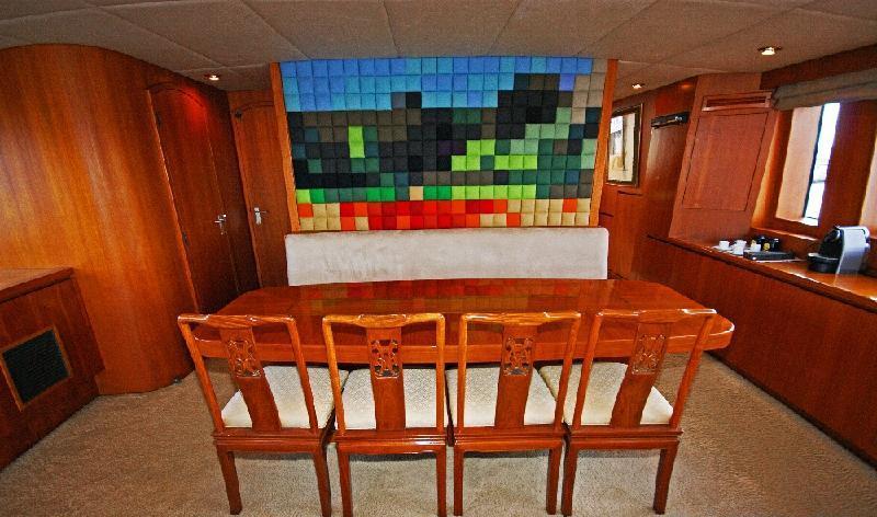 The main salon and dining are open plan, allowing for versatile uses from intimate social gatherings, to cocktail entertaining. The lounge features crisp white soft furnishings, coffee table and neutral carpeting. Forward, the formal dining area seats 8 guests easily. Panoramic windows provide idyllic views and plenty of natural light.
