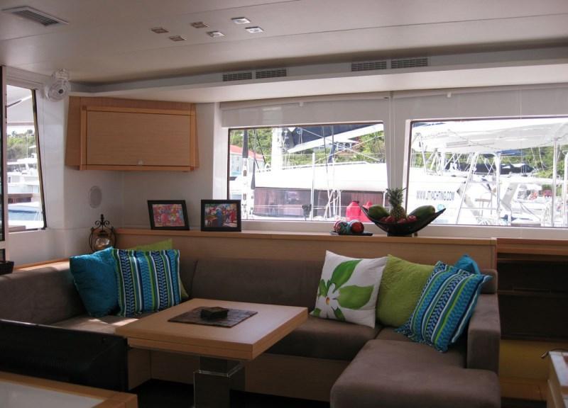 Large sliding glass doors open onto the generous shaded aft cockpit, further lounge seating and an alfresco dining table.
