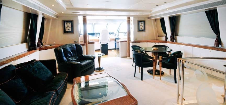 Charter yacht OBSESSIONS offers a further indoor guest area on the upper deck, aft of the pilot house, in the sky lounge. This is the perfect space to interact with the crew, socialize amongst one another, enjoy a movie, or simply take in the scenic vistas.