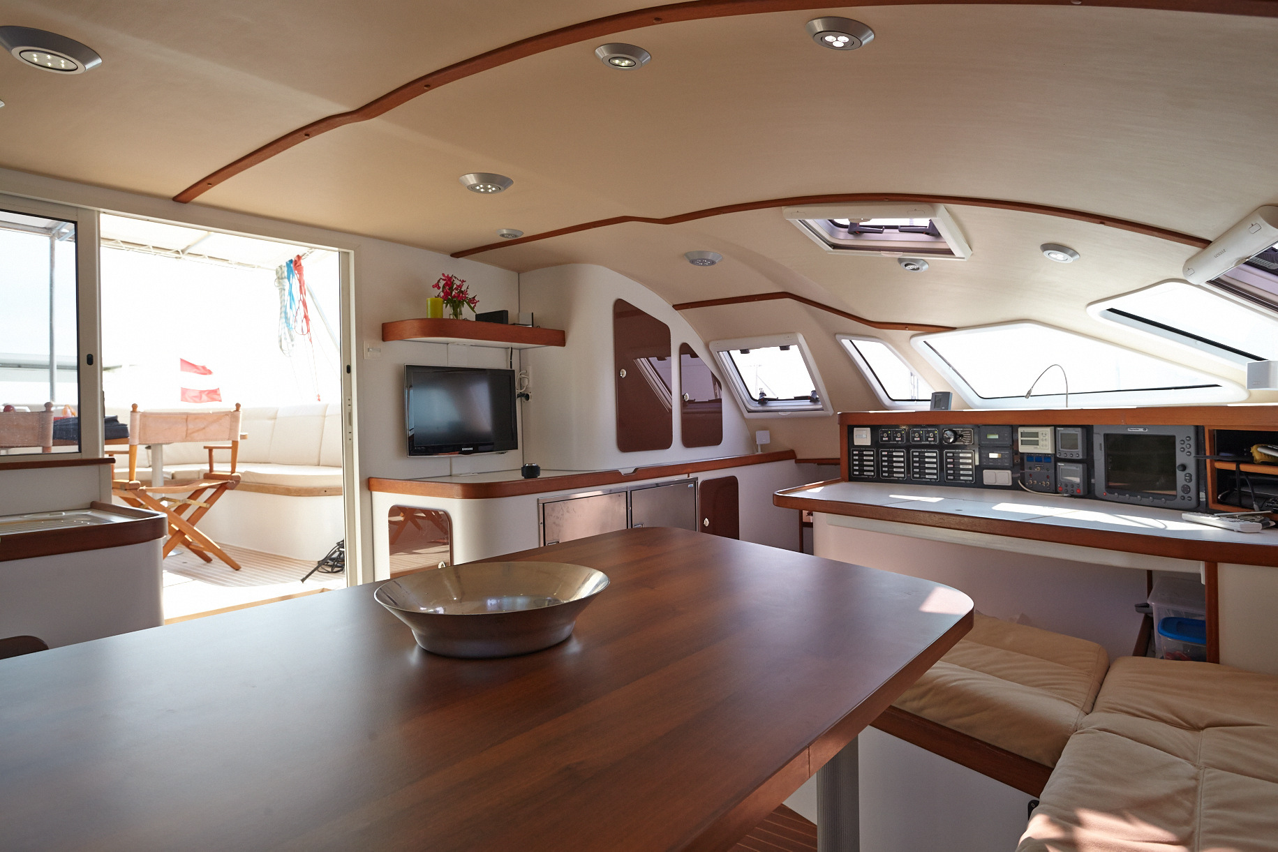The salon offers a sitting area for 8 - 10 charter guests. The navigation area is on the larboard side of the salon. Its design is driven by the spirit of simplicity, elegance and lightness. The MALISI catamaran boasts a full BOSE audio system as well as a Macintosh entertainment system with a 42'' TV Set in the salon.