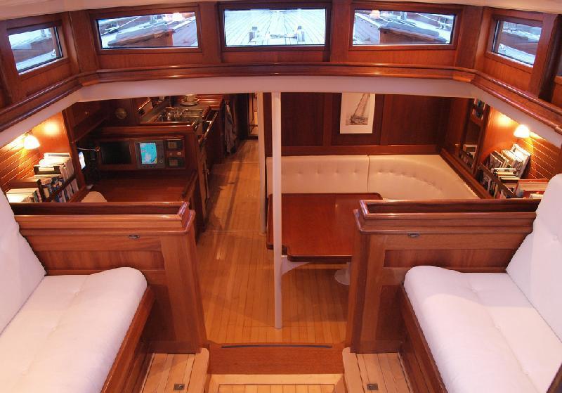The salon features a built in L shaped settee with formal dining table to starboard and opposing sofa on the port. A raised deck house with surrounding windows provides ample natural light and a greater sense of space. Guest cabins are forward of the salon on port and starboard.