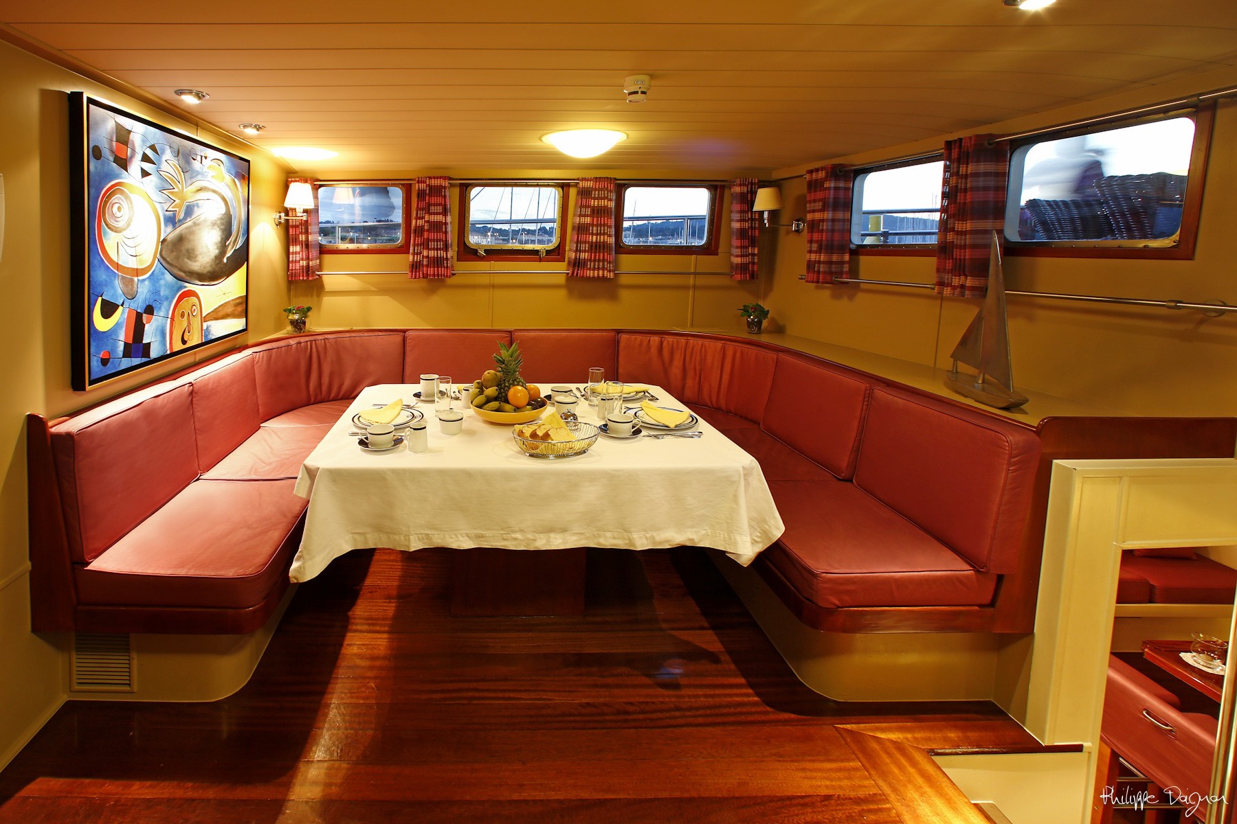 The formal dining area is upon entering the aft companionway and offers plenty of seating for all 12 guests. Further forward, the salon is spacious and light, offering comfortable seating and indoor entertainment options.