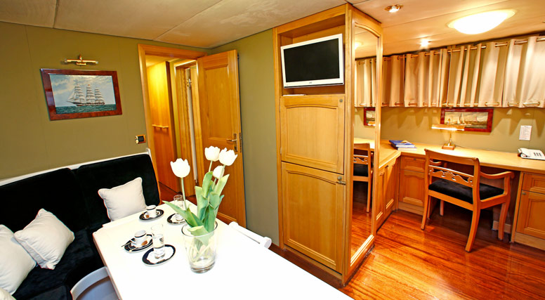 Crewed charter yacht MEPHISTO offers accommodation for up to 12 guests in 6 en-suite cabins, each cabin boasts a mini lounge area and TV/DVD entertainment. The master cabin is forward on the main deck, with a center lined double bed and single berth. Below decks a double cabin offers a double bed and single bed.