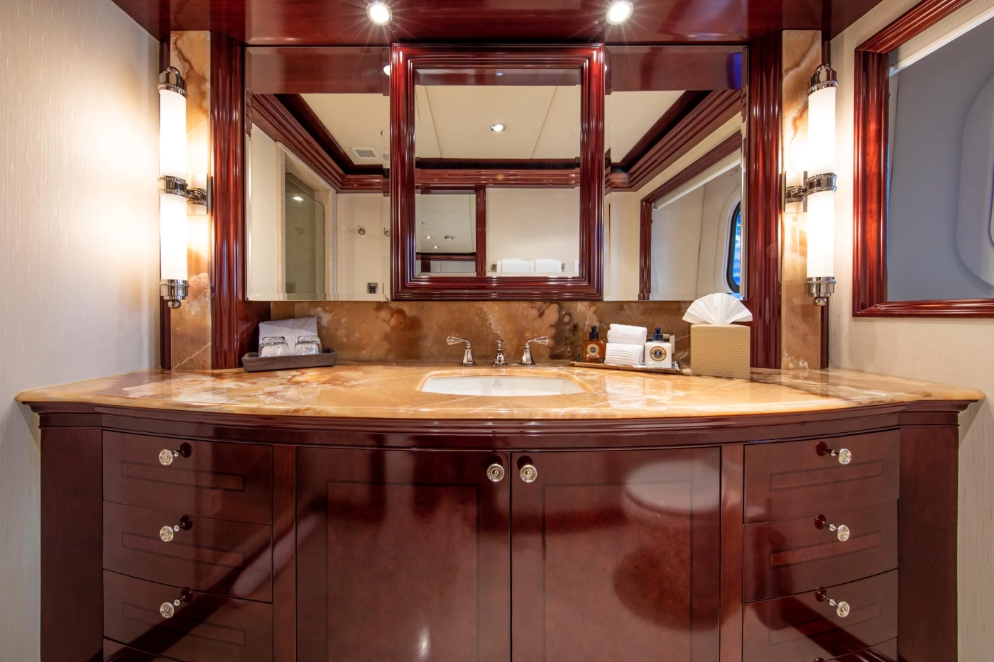 The salon is on the main deck offering plenty of plush seating on 2 sofas and 4 occasional chairs, a grand piano exudes elegance and is a fabulous focal point.