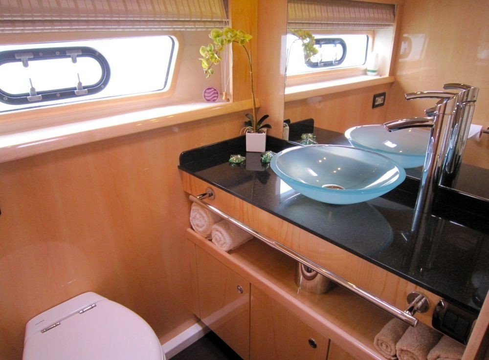 The master suite is forward offering a center lined king size bed, sofa, vanity/desk and en-suite with his and hers sinks plus Spa Pool tub. A further 3 cabins have queen size beds. All 4 cabins boast large shower rooms with massage shower units, TV entertainment and ample natural light. Yacht CATTITUDE is fully air conditioned throughout.