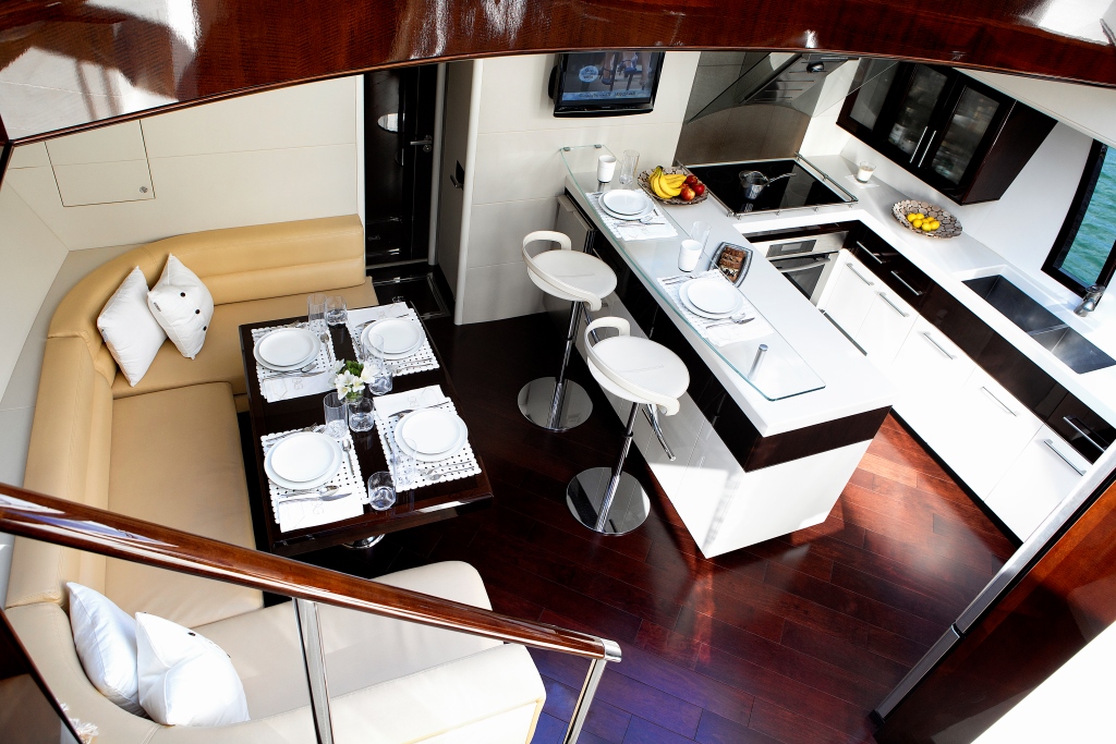 Motor yacht BG’s upper salon is generous, offering a large L shaped sofa, coffee table, TV entertainment and panoramic windows. Glass doors lead out onto the aft deck where guests may dine alfresco, enjoy an aperitif at the cocktail table and soak up the sunshine on the large aft sunpad.