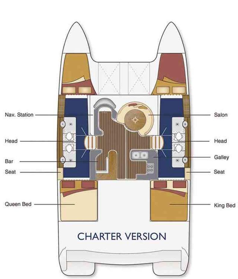 The salon is an open plan with a large settee and integrated formal dining table, complete galley and TV entertainment. Guest accommodation is in the port and starboard hull, all with double beds. The catamaran WILD ORCHID is ...