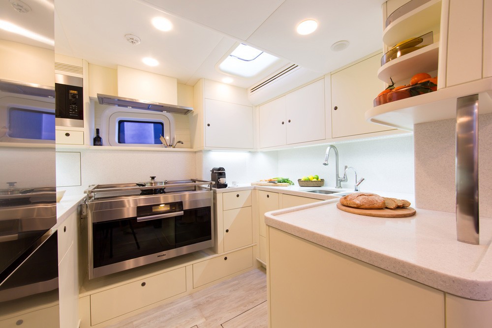 The master stateroom is aft and full beam of the yacht, featuring a center lined king size bed, sofa and vanity. A further 2 cabins offer side by side twin beds, with the option of conversions to doubles, both guest cabins also offer an upper Pullman berth. Each cabin is light and airy, with a tasteful modern décor.