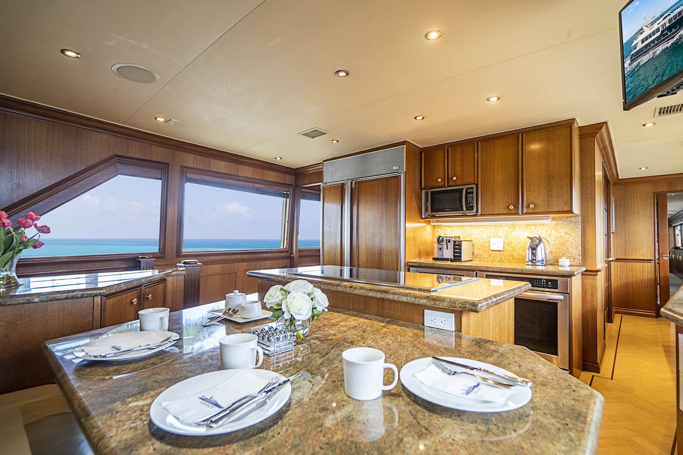 TRUE NORTH has ample exterior deck space. The aft deck is shaded offering comfortable seating and an alfresco dining option, the salon gives access to the aft deck, making the area versatile for any occasion.