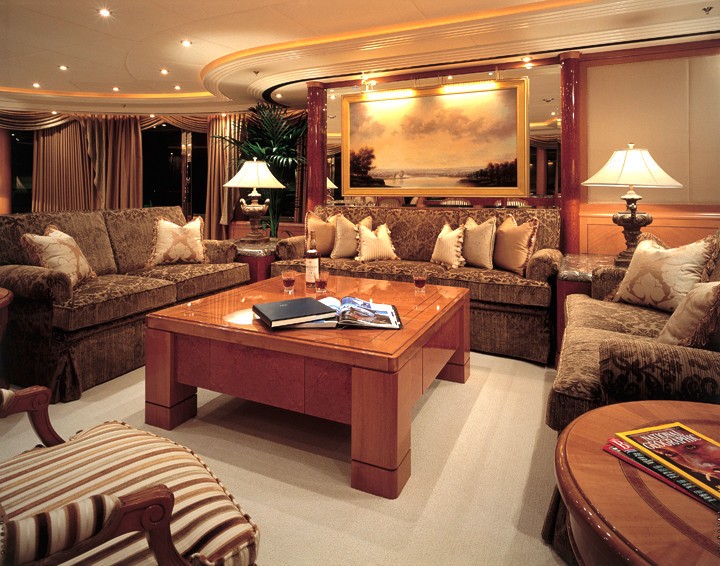 The warm and welcoming interior includes the elegant main saloon which stretches across the whole width of the boat and comes complete with numerous accessories such as 62" plasma screen, computer, entertainment room, stereo system and a special room for listening to music or for use as a private office.