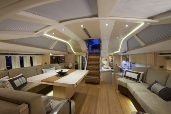 The salon and dining are an open plan. A formal dining table seats 6 guests with ease on the starboard side and a lounge on port, offers additional salon seating for optimum relaxation. A full entertainment center features the latest in electronics and technology.