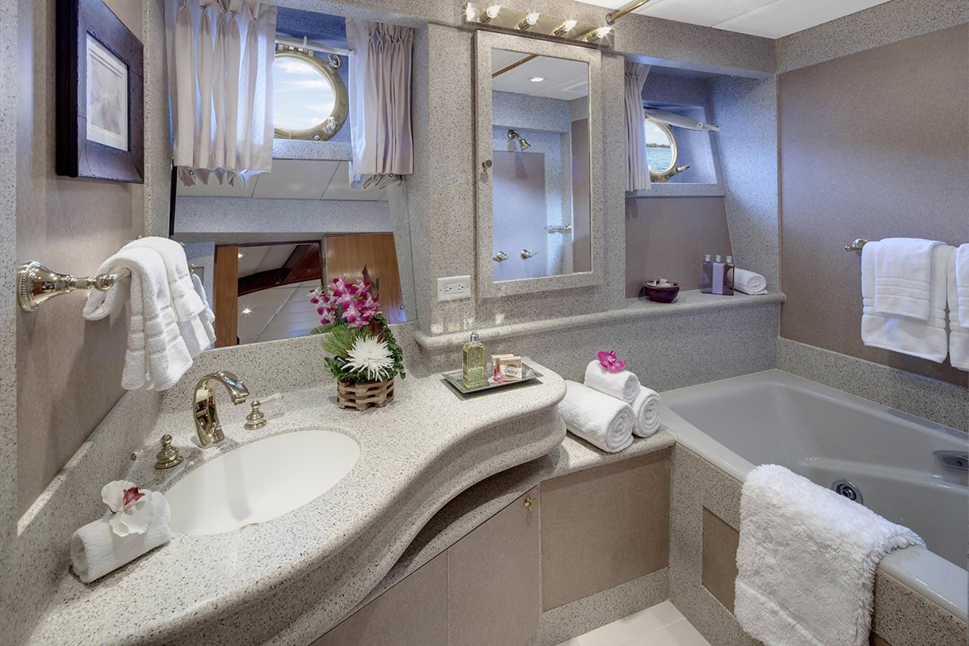 The full beam Master Stateroom features a Spa Pool tub in its ensuite bathroom. By means of a pocket door the Master Stateroom can be joined with an adjacent cabin that converts to a study forming an even more spacious Master Suite.