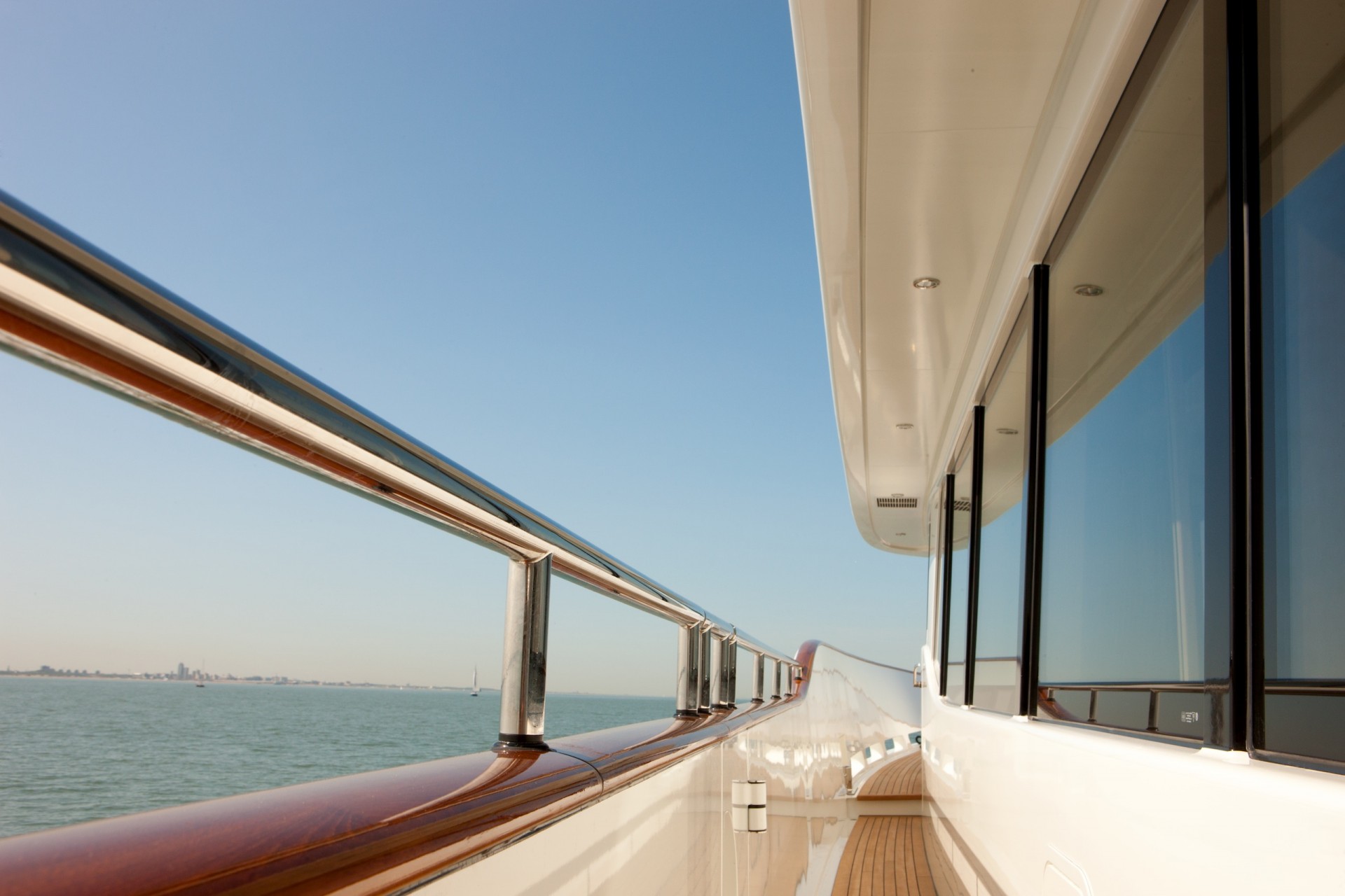 Below decks, FIREFLY boats a generous full width master stateroom of more than 24 square meters, incorporating a study, sitting area and an ensuite with bath and a walk-in robe. The ocean theme continues throughout the cabins with the use of soft materials and enhanced by rippling steel artwork commissioned by sculptor Rado Kirov.