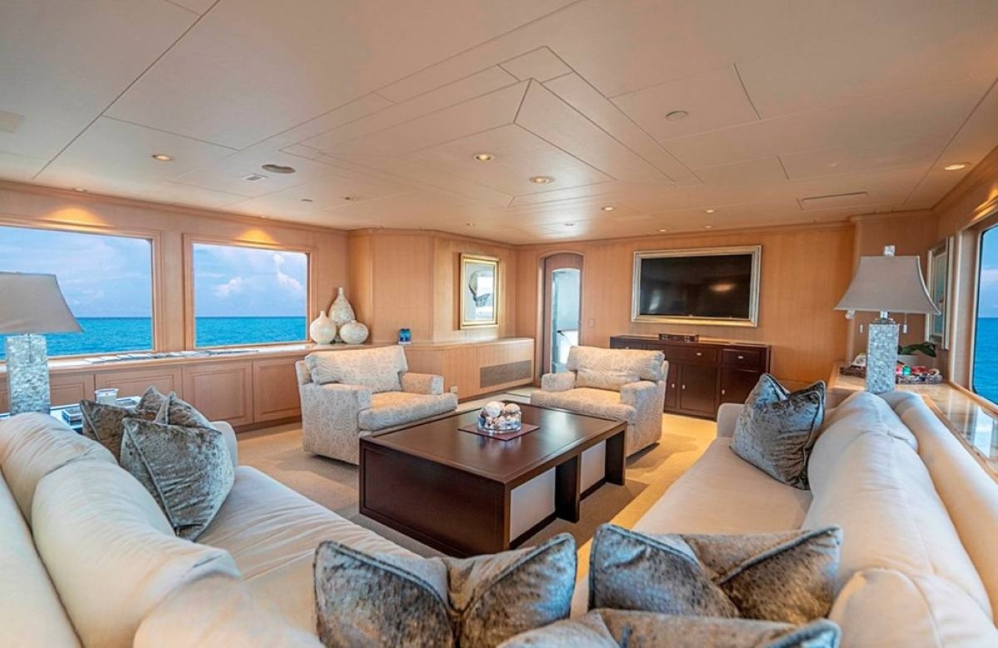 The main salon offers a plush L-shaped sofa and coffee table, with integrated ottomans. In an open plan, the formal dining sits forward of the lounge space, creating a contemporary and social ambience.