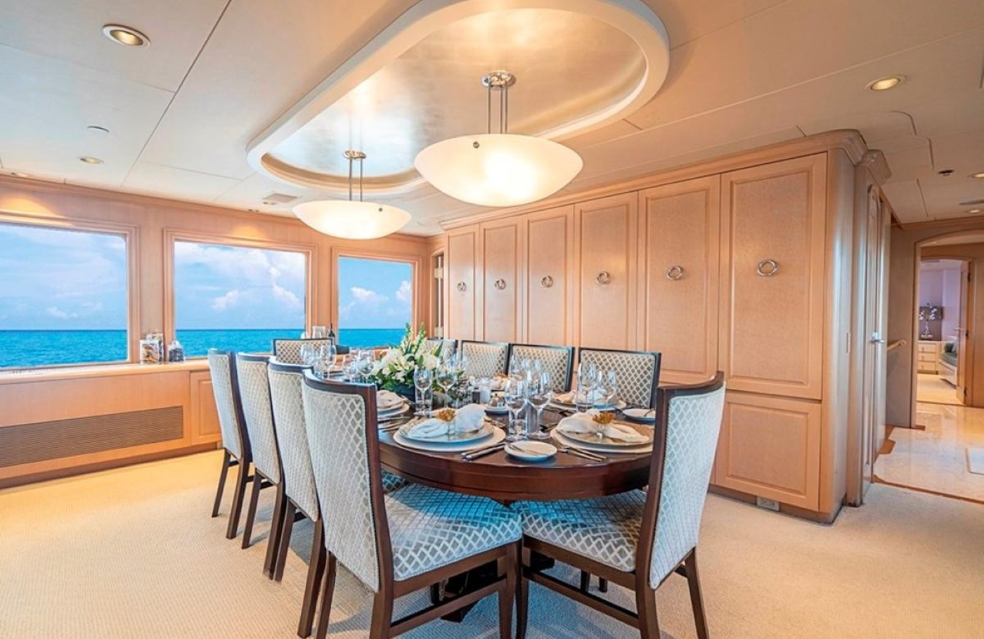 In an open plan, the formal dining sits forward of the lounge space, creating a contemporary and social ambience. A foyer on the starboard side, continues forward to the full beam VIP cabin, while also giving access to the lower deck cabins and upper deck sky lounge.