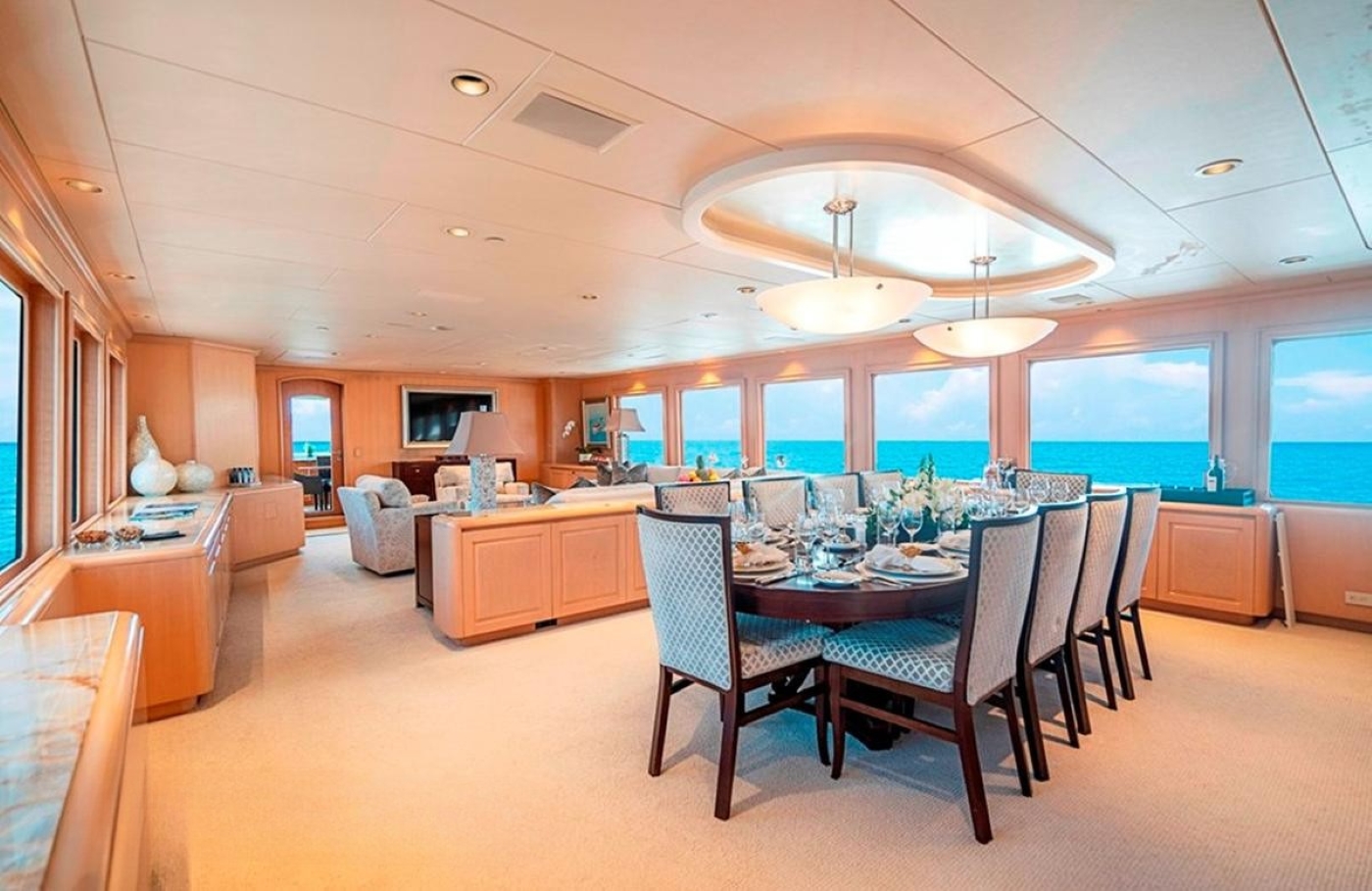 In an open plan, the formal dining sits forward of the lounge space, creating a contemporary and social ambience. A foyer on the starboard side, continues forward to the full beam VIP cabin, while also giving access to the lower deck cabins and upper deck sky lounge.