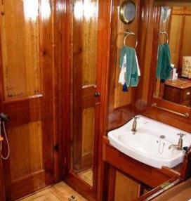 Aft, a master suite offers a full beam layout with 2 single beds on port and starboard and en-suite facilities. A further guest cabin has a single bed and Pullman berth, this cabin offers a sink and shared facilities.