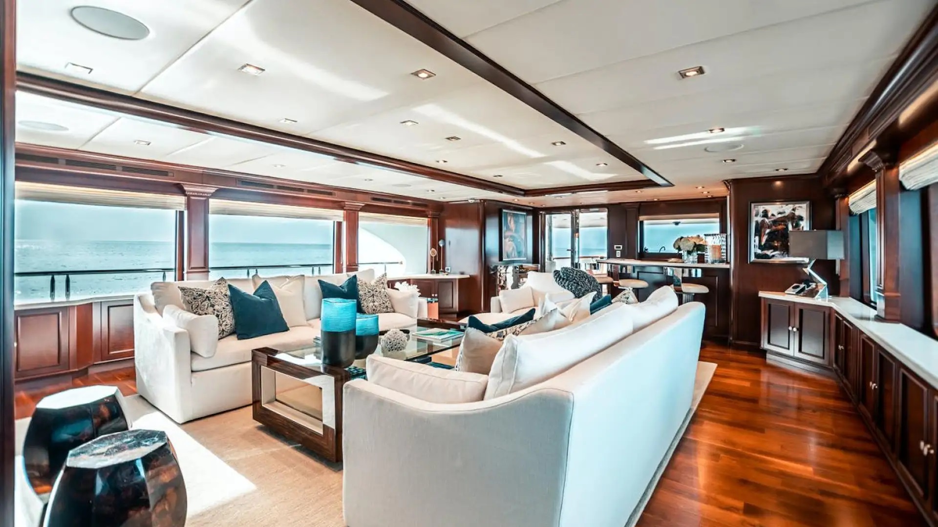 On the main deck, the salon is social and elegant, boasting crisp white leather soft furnishings, centered with a large coffee table, complete wet bar aft and formal dining area forward. A spacious foyer on the starboard side leads forward to a day head, followed by a private foyer, to the full beam master stateroom.