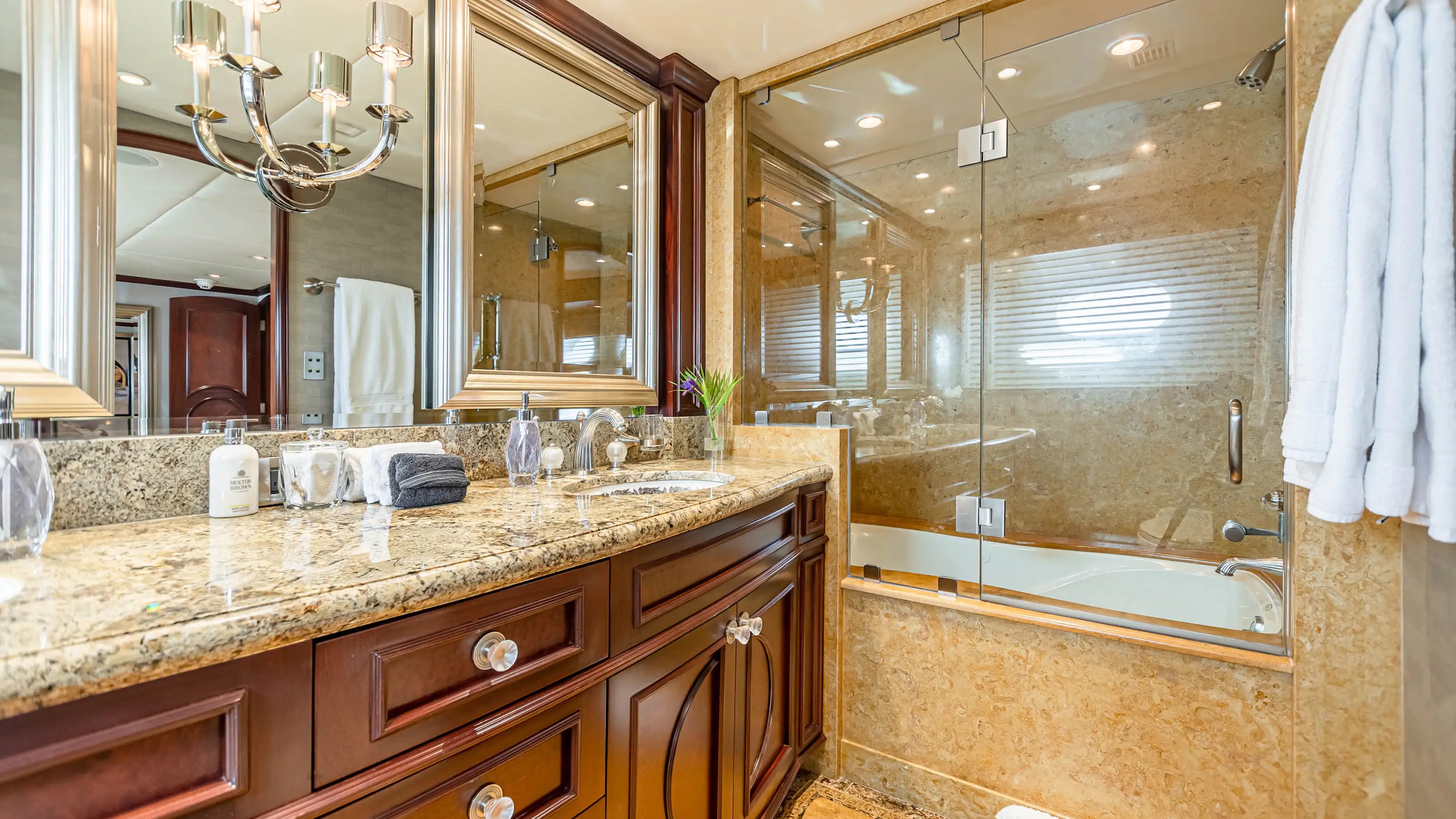 On the main deck, the salon is social and elegant, boasting crisp white leather soft furnishings, centered with a large coffee table, complete wet bar aft and formal dining area forward. A spacious foyer on the starboard side leads forward to a day head, followed by a private foyer, to the full beam master stateroom.