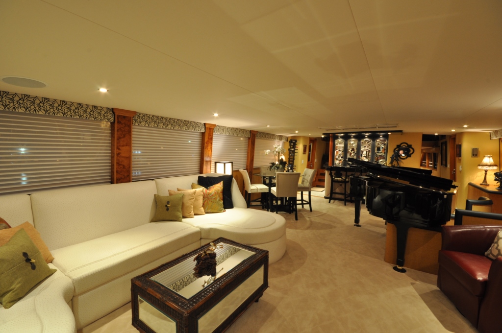 The salon and dining area are an open plan, perfect for entertaining. The lounge is aft and features a sofa, coffee table, occasional chairs and audio/visual systems. Forward on the port side, is a clear glass formal dining table, to starboard is an impressive piano.