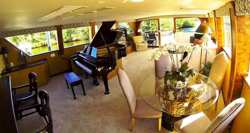 The salon and dining area are an open plan, perfect for entertaining. The lounge is aft and features a sofa, coffee table, occasional chairs and audio/visual systems. Forward on the port side, is a clear glass formal dining table, to starboard is an impressive piano.