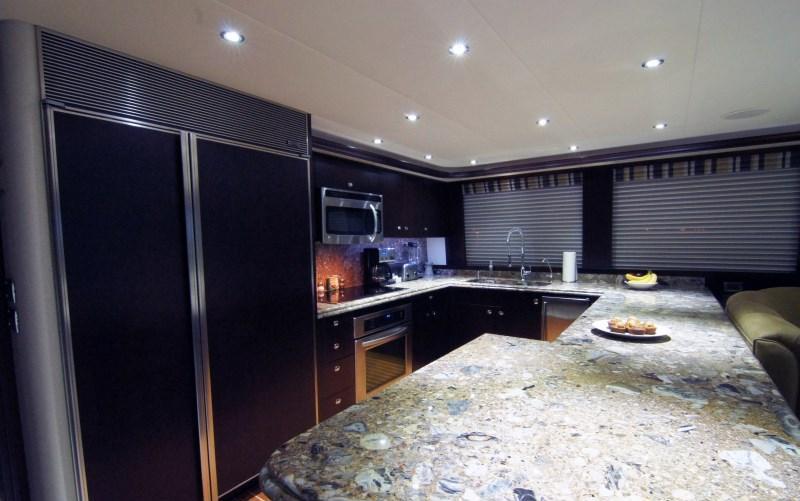 Moving forward through the starboard foyer, the country style galley is adorned in fine marble counter tops and boasts a further casual dining area. The main deck is light and airy, surrounded by panoramic windows, ensuring unrivalled views. Guest accommodation is below decks, in 4 well-appointed stylish cabins.