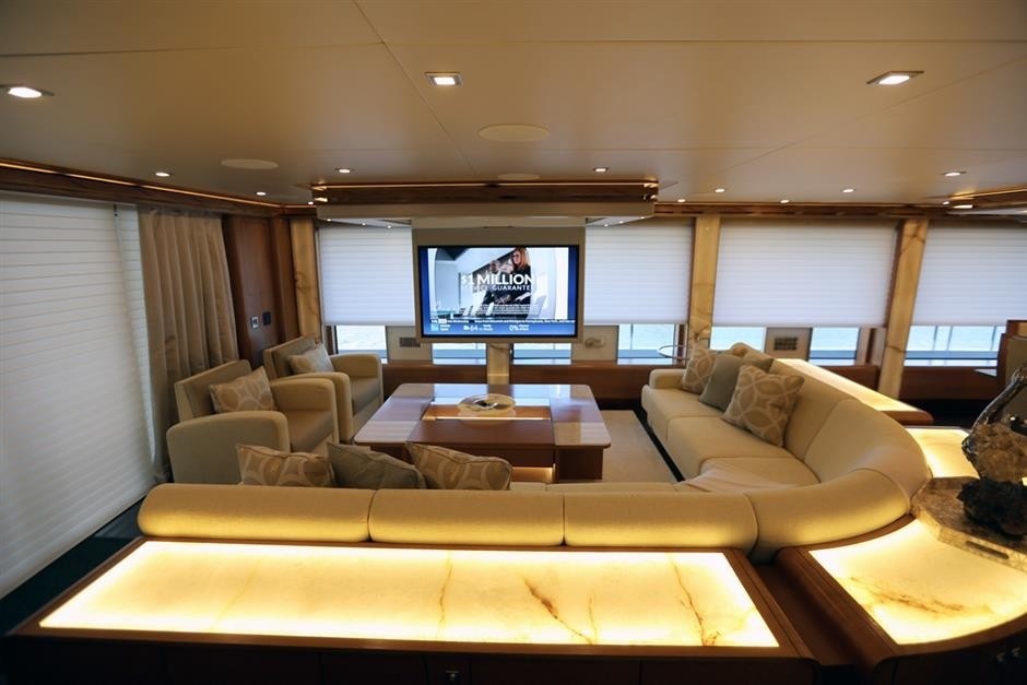Her interior decor is elegant, spacious and contemporary. On the main deck is a generous salon with open plan dining forward. The lounge offers a plush sofa, occasional chairs, coffee table and entertainment.