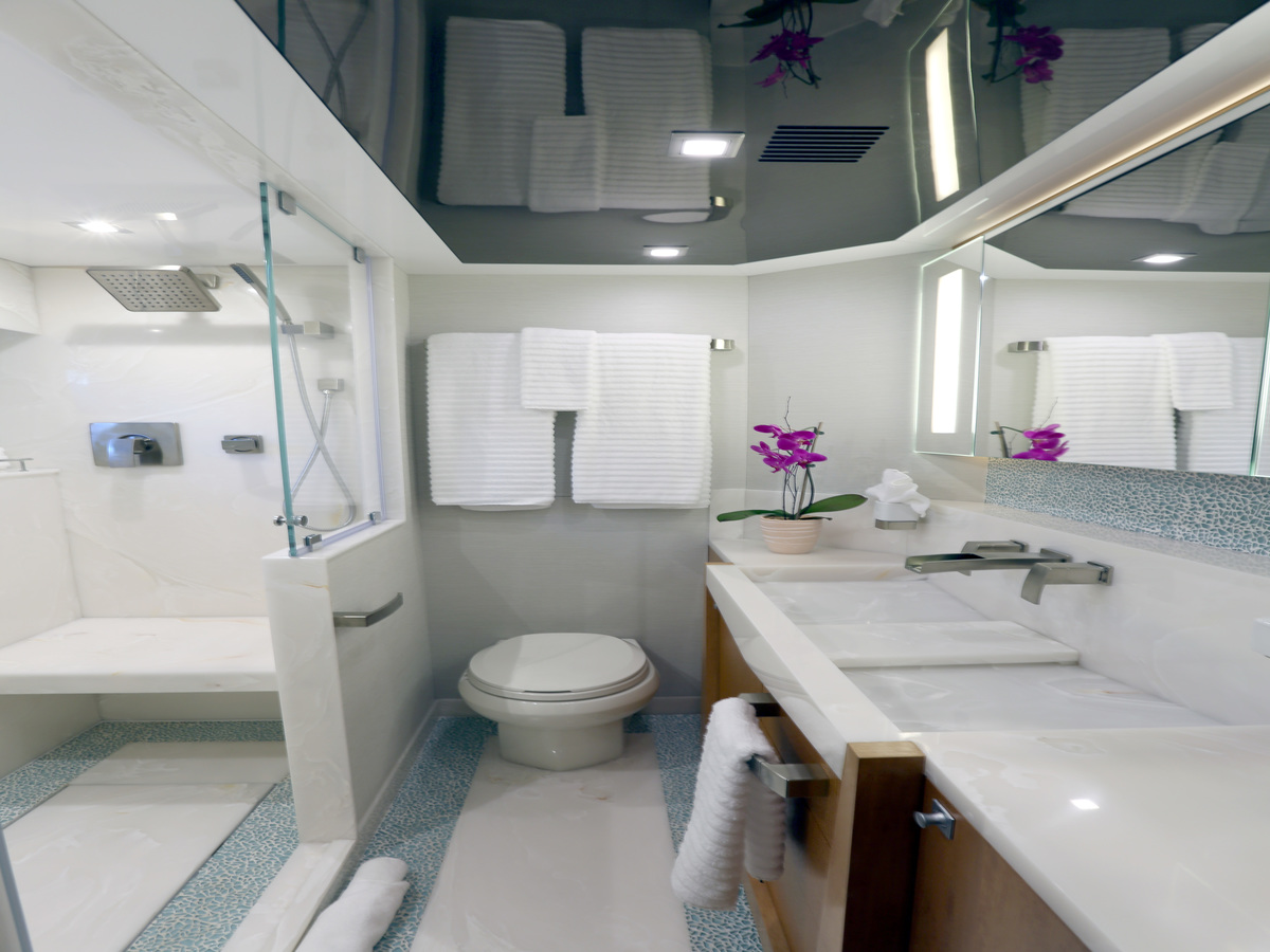 Her interior decor is elegant, spacious and contemporary. On the main deck is a generous salon with open plan dining forward. The lounge offers a plush sofa, occasional chairs, coffee table and entertainment.