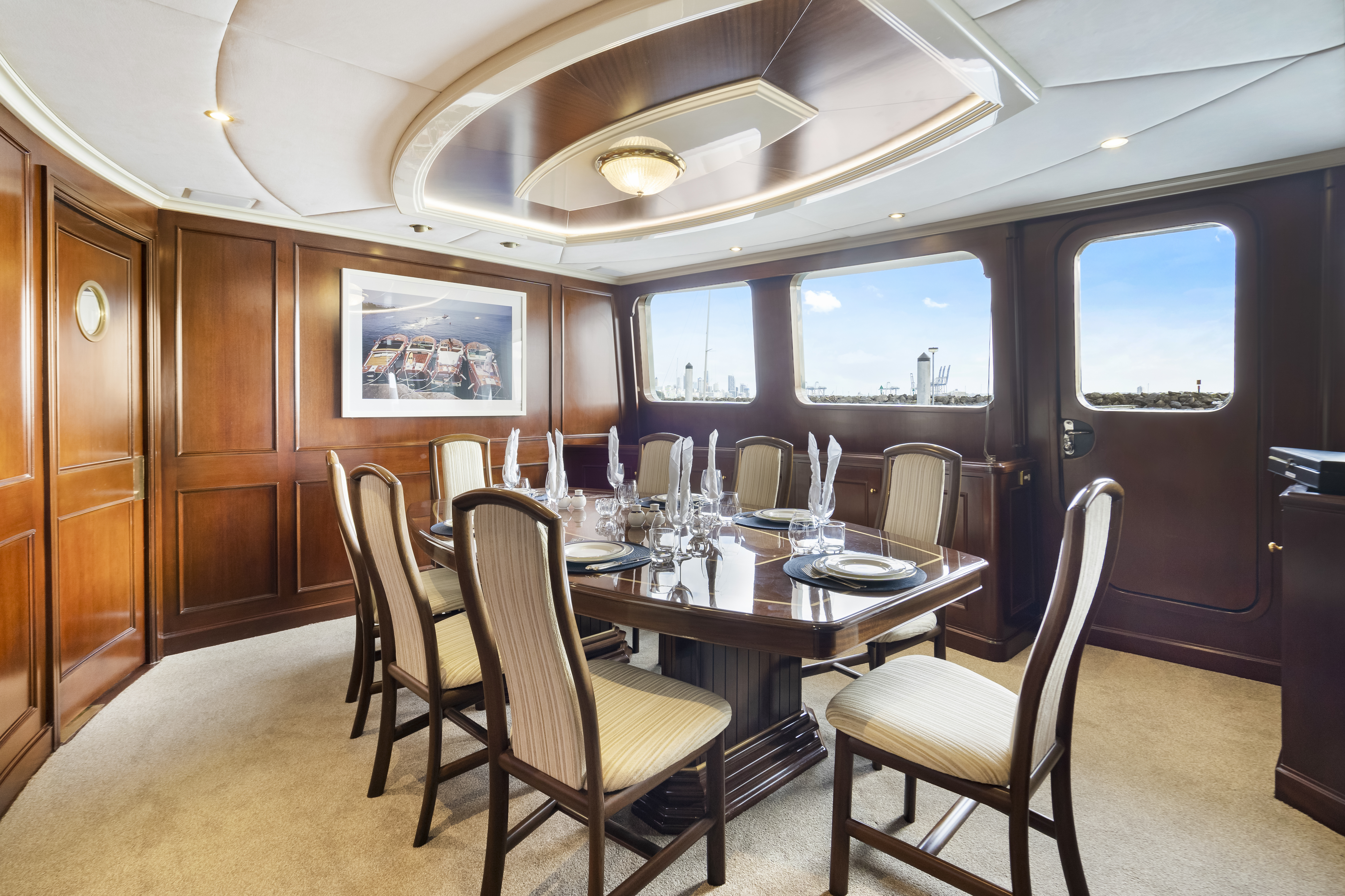 The master suite has a king size bed, vanity and en-suite with tub, in addition, the master cabin may be joined with a twin cabin, creating a study or fabulous family stateroom. A guest cabin offers a queen size bed, while 2 further cabins (one with access to the master) have twin single beds. A Pullman berth is available for a 9th guest.