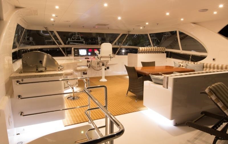 Above the main deck, the upper deck boasts a generous flybridge, complete with an additional alfresco dining option, ample seating, wet bar with fitted stools, large BBQ and chaise lounges, a great spot to spend a sunny afternoon or balmy evening.