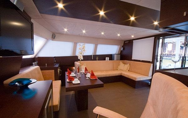 The salon and dining is a contemporary open plan, featuring earthy tones of dark Wenge woods with light Alcantara headliner and Skai upholstery. The galley is to port with a large counter, which serves well as a wet bar, idea for entertaining.
