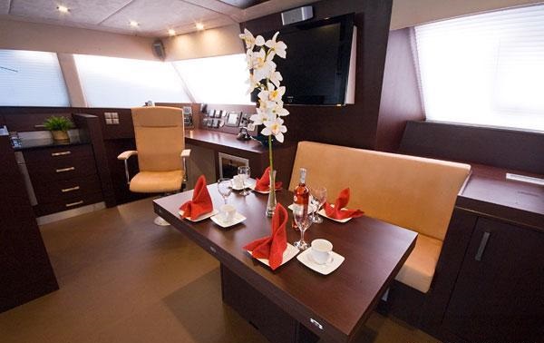 The salon and dining is a contemporary open plan, featuring earthy tones of dark Wenge woods with light Alcantara headliner and Skai upholstery. The galley is to port with a large counter, which serves well as a wet bar, idea for entertaining.