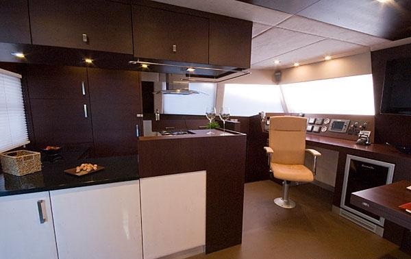 The galley is to port with a large counter, which serves well as a wet bar, idea for entertaining. The lounge boasts an L shaped sofa and coffee table to starboard, with the formal dining table forward. Guest accommodation is in both the port and starboard hulls, each with private en-suite facilities.