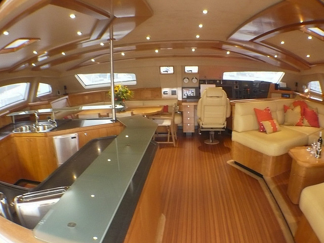 The salon and dining is an open plan, with the lounge on the starboard side, formal dining port and forward, plus the well-equipped galley port and aft. The Galley offers a glass top breakfast bar, also ideal for evening cocktails.