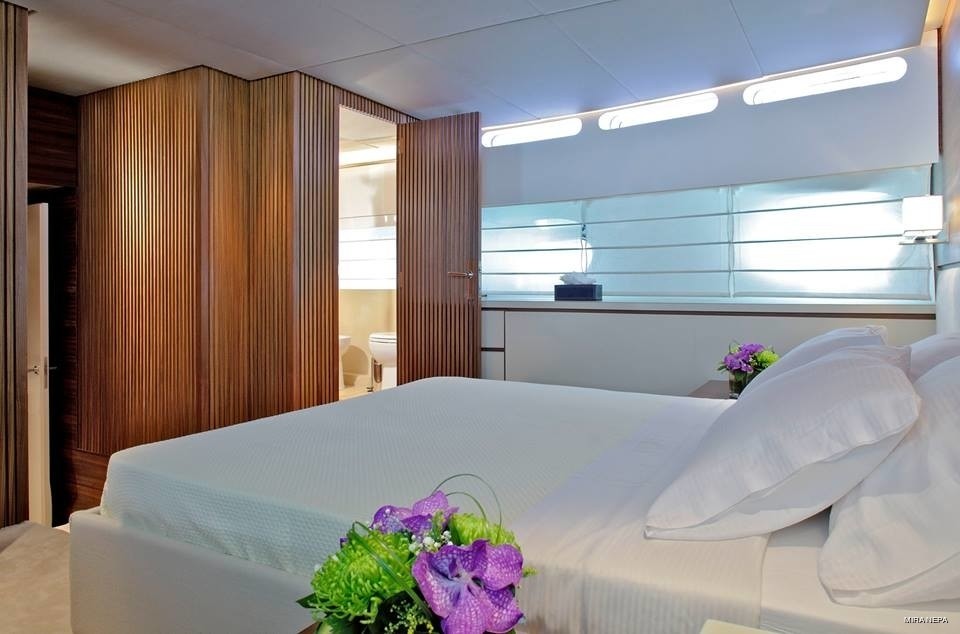 Beyond the aft deck, the transom features an extended swim platform and water toys garage, perfect for all the water enthusiasts. Above the main deck, guests can sit back on one of the chaise lounges or sun pad, dine alfresco and enjoy the yachts impressive speeds underway.