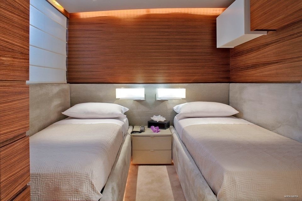 The interior is bright and airy, featuring plenty of natural light, crisp white finishes and soothing woods throughout. The salon is open plan and inviting, boasting great views from the port and starboard windows. Further forward, the master stateroom is full beam of the yacht, with a king size bed and large en-suite facilities.
