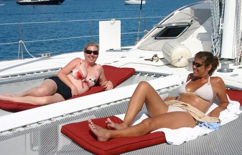 With a beam of 7.6m (30ft), the GREEN FLASH catamaran has wide side decks, leading to her ample bow deck, complete with sunning areas, 2 large trampolines with sunpads and bow seats, perfect for enjoying the yachts power under sail.