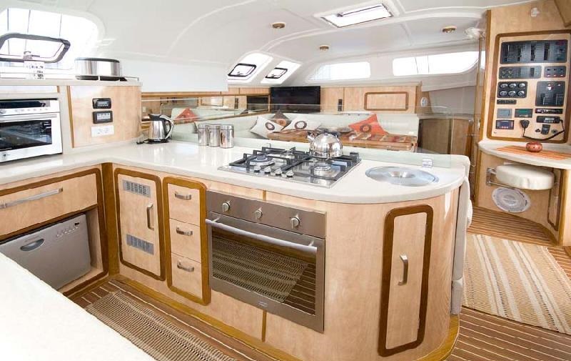 On the port side, the galley creates a social ambiance. The salon leads to the port and starboard hulls, with 4 double, en-suite cabins.