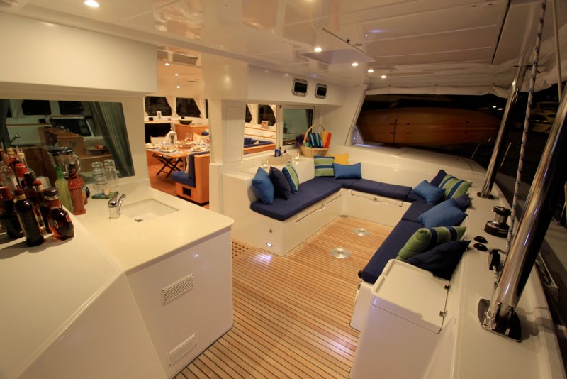 The aft deck is shaded and offers a social seating area, optional coffee table or alfresco dining table, drinks fridge, sink and direct access to the salon. Aft, the dual transoms are connected by a walk over deck, providing a fabulous water toys platform.