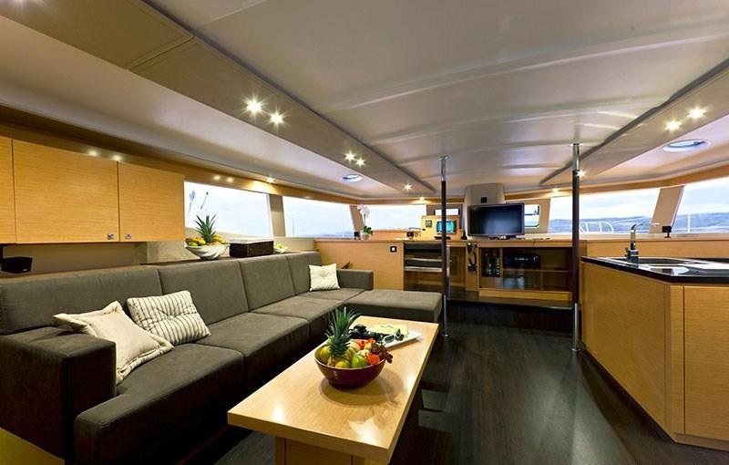 The salon has a spacious airy feel, featuring a comfortable lounge on the port side, with coffee table, open style galley to starboard, and navigation station forward. Surrounding windows allow ample natural light, while ...
